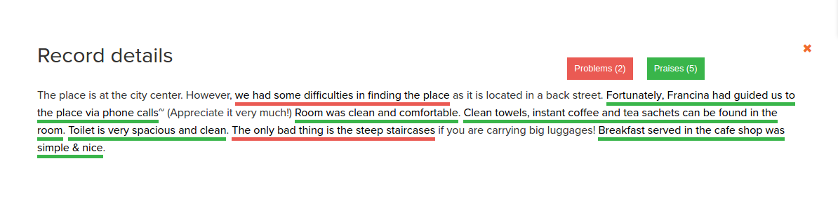 You can also click View record under a snippet to read the entire record and find out what was detected as positive, negative, etc. You can click on an opinion type to toggle it on or off.